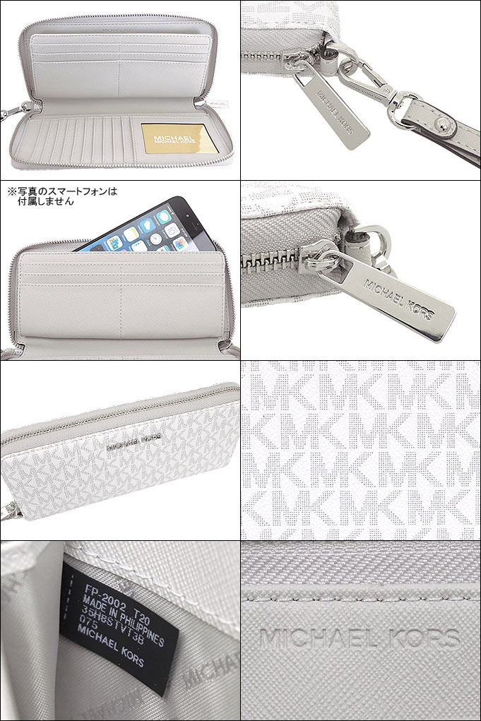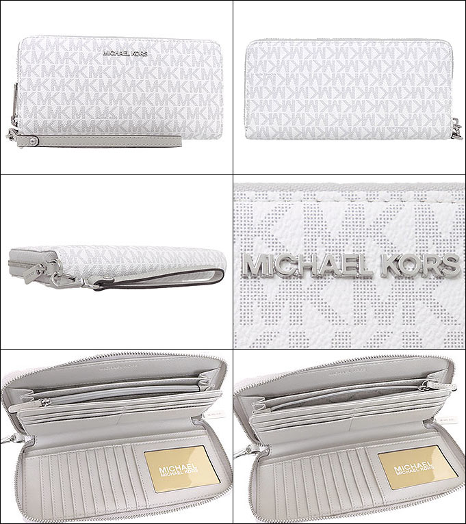 ●【マイケルコース MICHAEL KORS】 ジェット セット トラベル シグネチャー ラージ トラベル コンチネンタル ラウンド ジップ 名称JET SET TRAVEL LG TRVL CONTINENTAL 種類 小物/財布/長財布 サイズ 横幅:21cm 高さ:10cm マチ:2.5cm ストラップ全長:19cm 重さ:310g 仕様本体:ファスナー開閉 内部:マチ付き札入れ×3 ファスナー付き小銭入れ×1 カード入れ×16 ポケット×3 パスケース×1 ストラップ取り外し可能 素材PVCコーティングキャンバス×レザー カラー アルミニウム ALUMINUM 【金具の色】シルバー 型番 35H8STVT3B 付属品 なし 【2020 秋冬 新作】 マイケルコース MICHAEL KORSの財布(長財布)です。