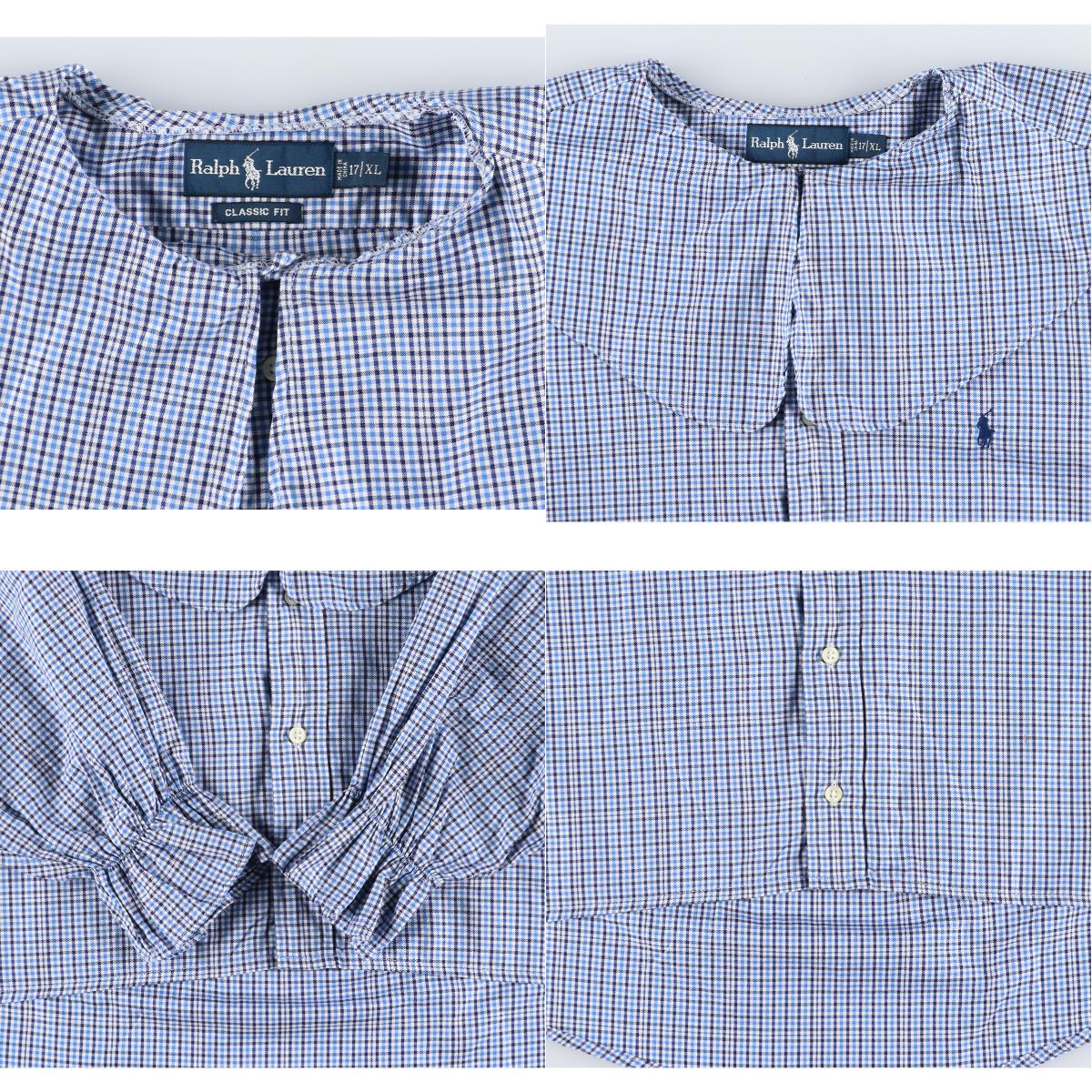 ・Ralph Lauren 長袖 ビッグカラーリメイクシャツ / レディースM / 商品番号 eaa035409△メンズサイズのシャツを全体的に小さくリサイズし、襟をビッグカラーに裾を短くリメイクしています。